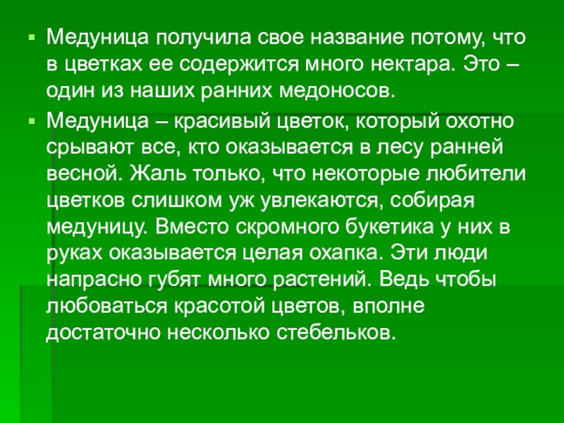 Медуница – красивый цветок, который охотно срывают все, кто оказывается в лесу ранней весной. Жаль только, что некоторые любители цветков слишком уж увлекаются, собирая медуницу. Вместо скромного букетика у них в руках оказывается целая охапка. Эти люди напрасно губят много растений. Ведь чтобы любоваться красотой цветов, вполне достаточно несколько стебельков.
