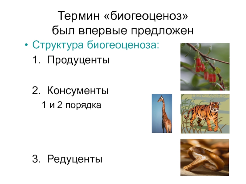 Термин «биогеоценоз» был впервые предложен Структура биогеоценоза:  1. Продуценты  2. Консументы    1