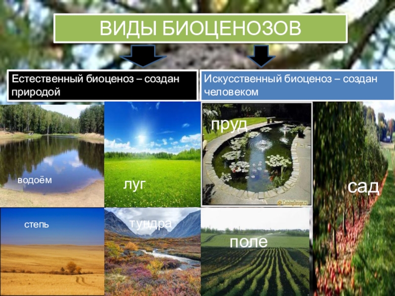ВИДЫ БИОЦЕНОЗОВЕстественный биоценоз – создан природойИскусственный биоценоз – создан человекомводоёмлугстепьтундрапрудполесад