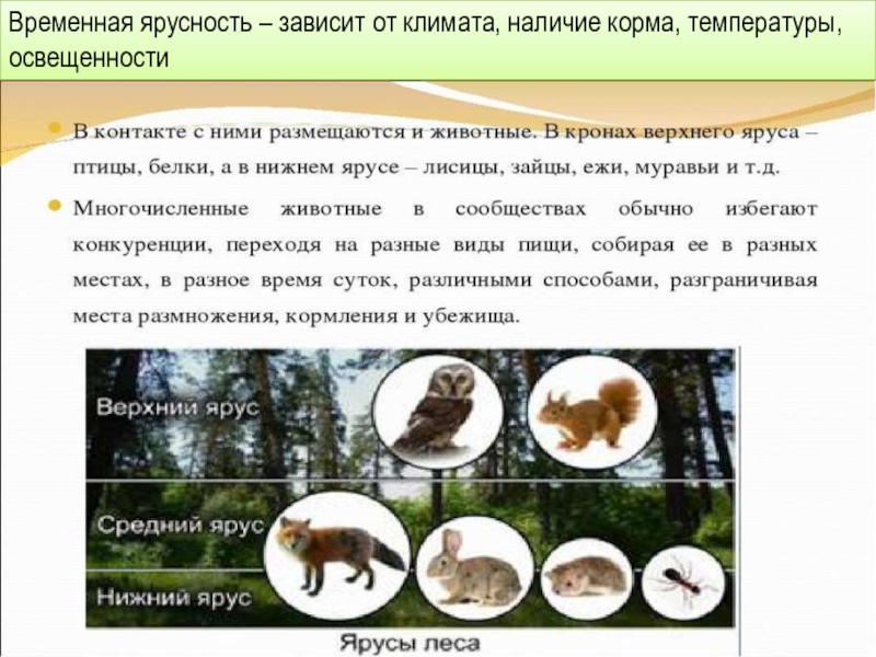 Слайд 6Временная ярусность – зависит от климата, наличие корма, температуры, освещенности