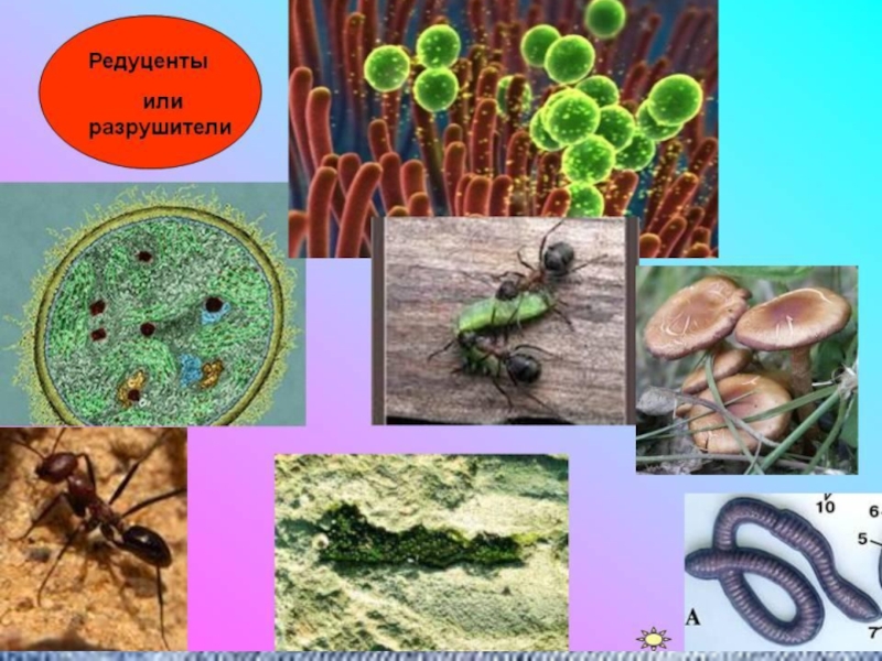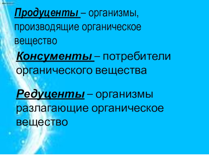 Продуценты – организмы, производящие органическое веществоКонсументы – потребители органического веществаРедуценты – организмы разлагающие органическое вещество