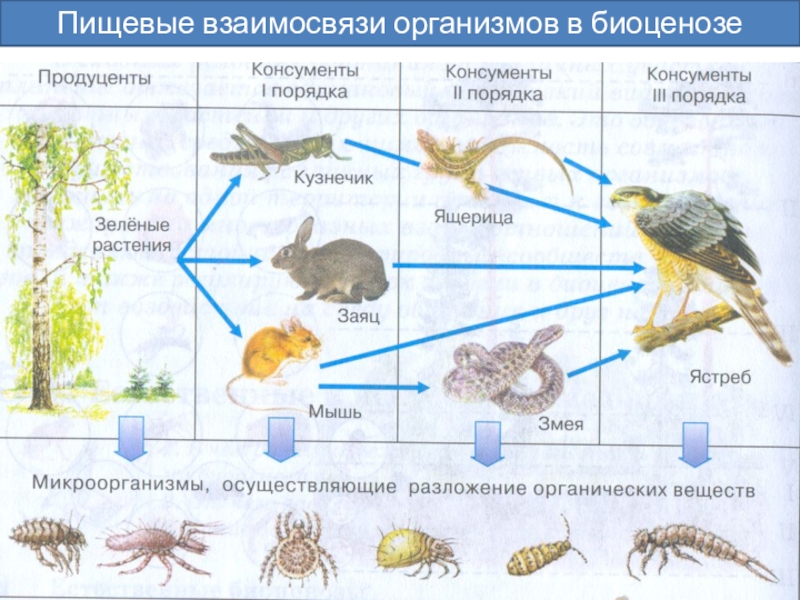 Слайд 12Пищевые взаимосвязи организмов в биоценозе
