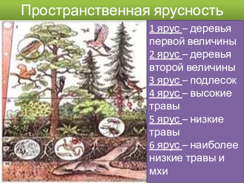 Пространственная ярусность1 ярус – деревья первой величины2 ярус – деревья второй величины3 ярус – подлесок 4 ярус