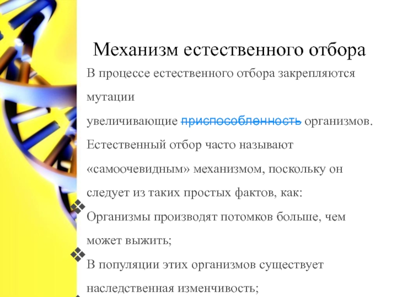 Механизм естественного отбораВ процессе естественного отбора закрепляются мутации увеличивающие приспособленность организмов. Естественный отбор часто называют «самоочевидным» механизмом, поскольку он