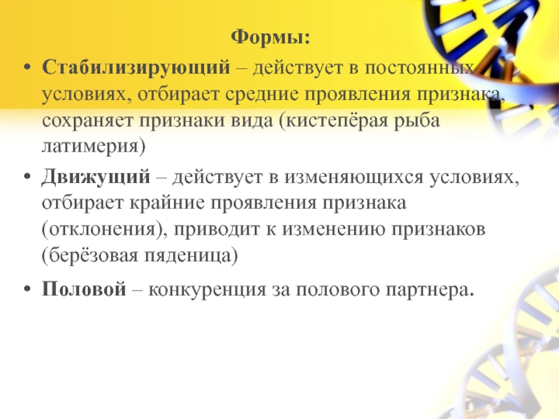 Формы:Стабилизирующий – действует в постоянных условиях, отбирает средние проявления признака, сохраняет признаки вида (кистепёрая рыба латимерия)Движущий –