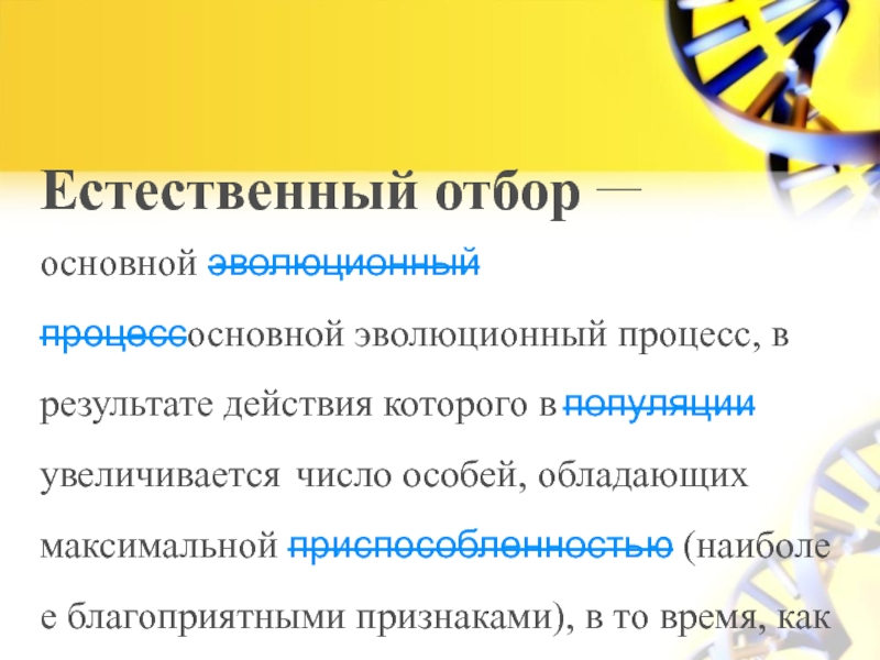 Естественный отбор — основной эволюционный процессосновной эволюционный процесс, в результате действия которого в популяции увеличивается число особей, обладающих максимальной приспособленностью (наиболее благоприятными признаками),