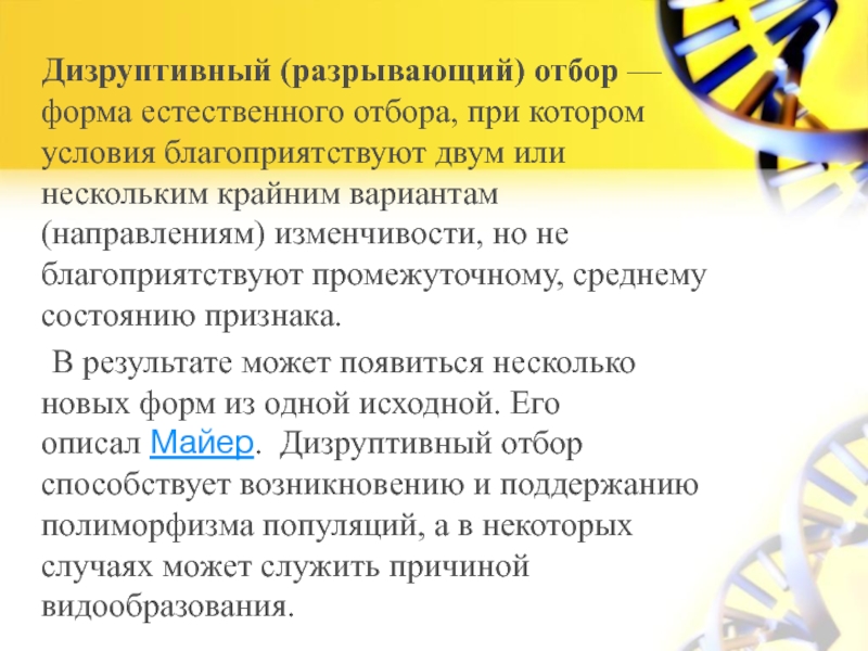 Слайд 10 Дизруптивный (разрывающий) отбор — форма естественного отбора, при котором условия