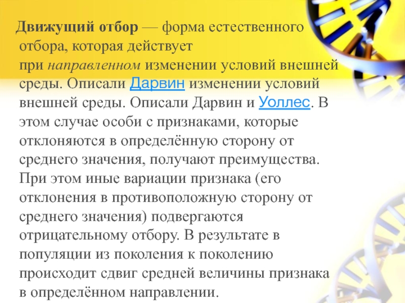 внешней среды. Описали Дарвин изменении условий внешней среды. Описали Дарвин и Уоллес. В этом случае особи с признаками, которые отклоняются в определённую сторону от среднего значения, получают преимущества. При этом иные вариации признака (его отклонения в противоположную сторону от среднего значения) подвергаются отрицательному отбору. В результате в популяции из поколения к поколению происходит сдвиг средней величины признака в определённом направлении.
