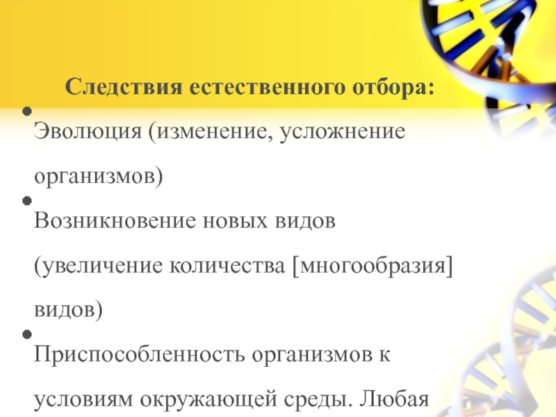 Следствия естественного отбора:Эволюция (изменение, усложнение организмов)Возникновение новых видов (увеличение количества [многообразия] видов)Приспособленность организмов к условиям окружающей среды. Любая
