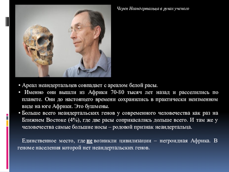 Неандертальцы были одними из наших предков. В генах современного человечества от 1% до 4% генома неандертальцев. За одним исключением: у негроидов южнее Сахары нет генов неандертальца.