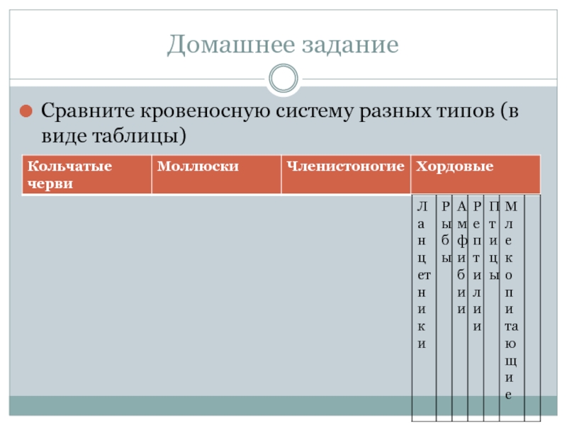 Домашнее заданиеСравните кровеносную систему разных типов (в виде таблицы)