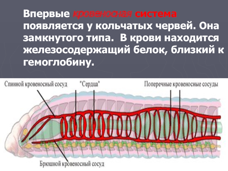 Впервые кровеносная система появляется у кольчатых червей. Она замкнутого типа. В крови находится железосодержащий белок, близкий к
