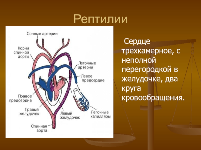 Рептилии	Сердце трехкамерное, с неполной перегородкой в желудочке, два круга кровообращения.
