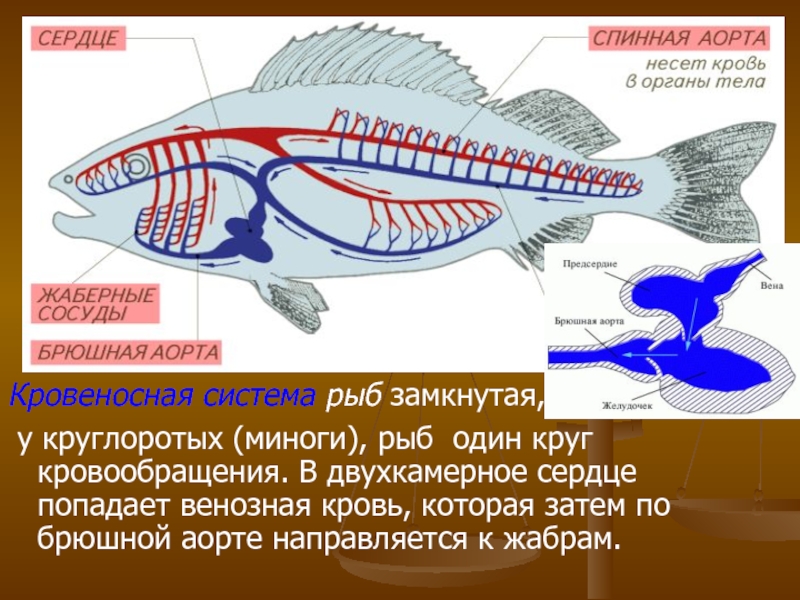 Кровеносная система рыб замкнутая, у круглоротых (миноги), рыб один круг кровообращения. В двухкамерное сердце попадает венозная кровь,