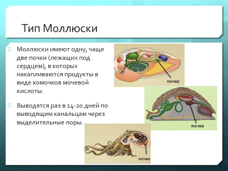 Моллюски имеют одну, чаще две почки (лежащих под сердцем), в