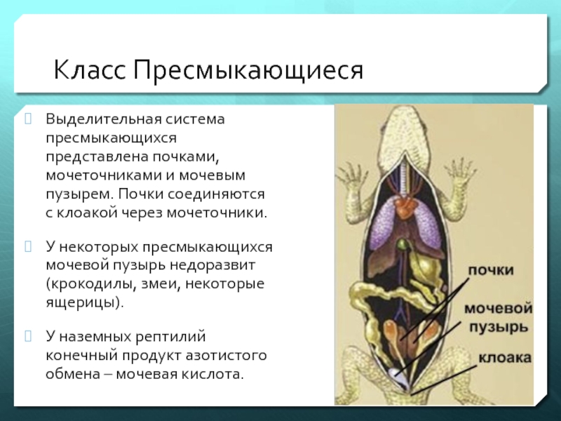 Выделительная система пресмыкающихся представлена почками, мочеточниками и мочевым пузырем. Почки