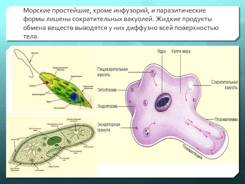 Слайд 3Морские простейшие, кроме инфузорий, и паразитические формы лишены сократительных вакуолей. Жидкие