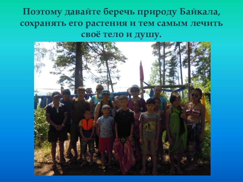 Слайд 15Поэтому давайте беречь природу Байкала, сохранять его растения и тем самым