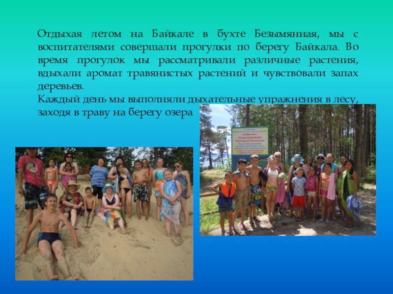 Слайд 8Отдыхая летом на Байкале в бухте Безымянная, мы с воспитателями совершали