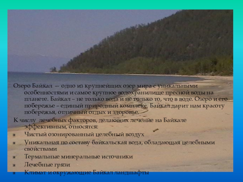 К числу лечебных факторов, делающих лечение на Байкале эффективным, относятся: