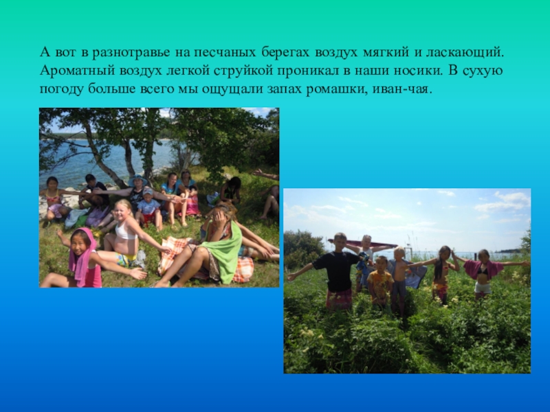 Слайд 10А вот в разнотравье на песчаных берегах воздух мягкий и ласкающий.