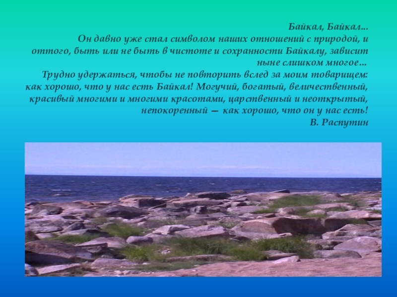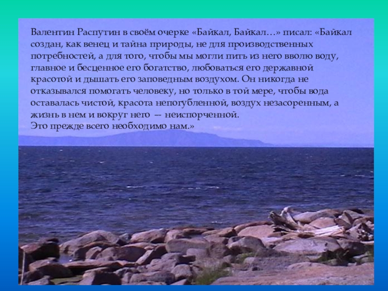 Слайд 14Валентин Распутин в своём очерке «Байкал, Байкал…» писал: «Байкал создан, как