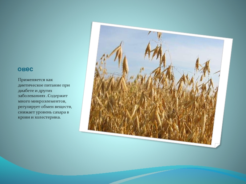 овесПрименяется как диетическое питание при диабете и других заболеваниях .Содержит много микроэлементов, регулирует обмен веществ, снижает уровень