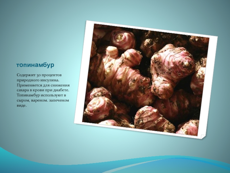 топинамбурСодержит 30 процентов природного инсулина. Применяется для снижения сахара в крови при диабете. Топинамбур используют в сыром,