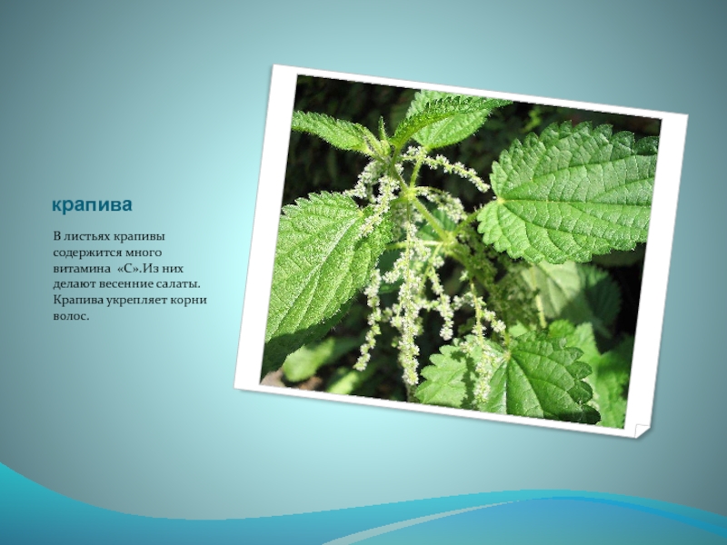 крапиваВ листьях крапивы содержится много витамина «С».Из них делают весенние салаты. Крапива укрепляет корни волос.