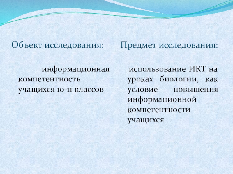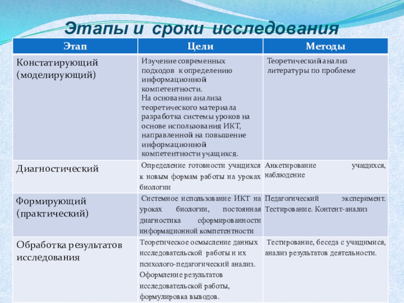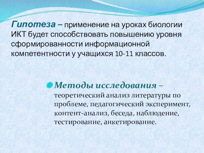 Методы исследования – теоретический анализ литературы по проблеме, педагогический эксперимент, контент-анализ, беседа, наблюдение, тестирование, анкетирование.