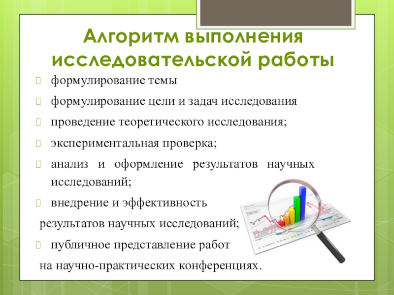 Алгоритм выполнения исследовательской работы формулирование темыформулирование цели и задач исследованияпроведение теоретического исследования;экспериментальная проверка;анализ и оформление результатов научных исследований;внедрение и эффективность результатов научных исследований;публичное представление работ на научно-практических конференциях.