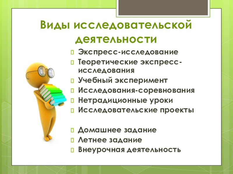 Виды исследовательской деятельностиЭкспресс-исследованиеТеоретические экспресс-исследованияУчебный экспериментИсследования-соревнованияНетрадиционные урокиИсследовательские проектыДомашнее заданиеЛетнее заданиеВнеурочная деятельность