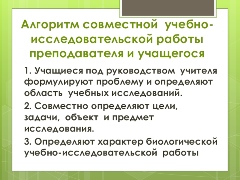 Алгоритм совместной  учебно-исследовательской работы преподавателя и учащегося1. Учащиеся под руководством  учителя формулируют проблему и определяют область  учебных