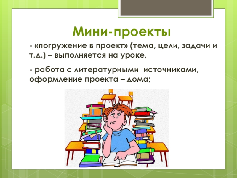 Мини-проекты- «погружение в проект» (тема, цели, задачи и т.д.) – выполняется на уроке, - работа с литературными