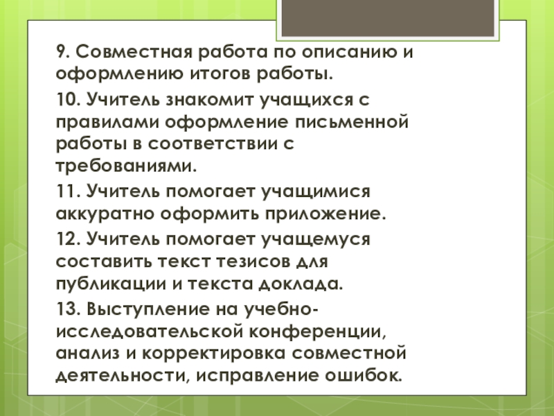 12. Учитель помогает учащемуся составить текст тезисов для публикации и текста доклада.