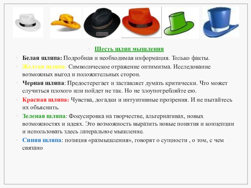 Черная шляпа: Предостерегает и заставляет думать критически. Что может случиться плохого или пойдет не так. Но не злоупотребляйте ею.
