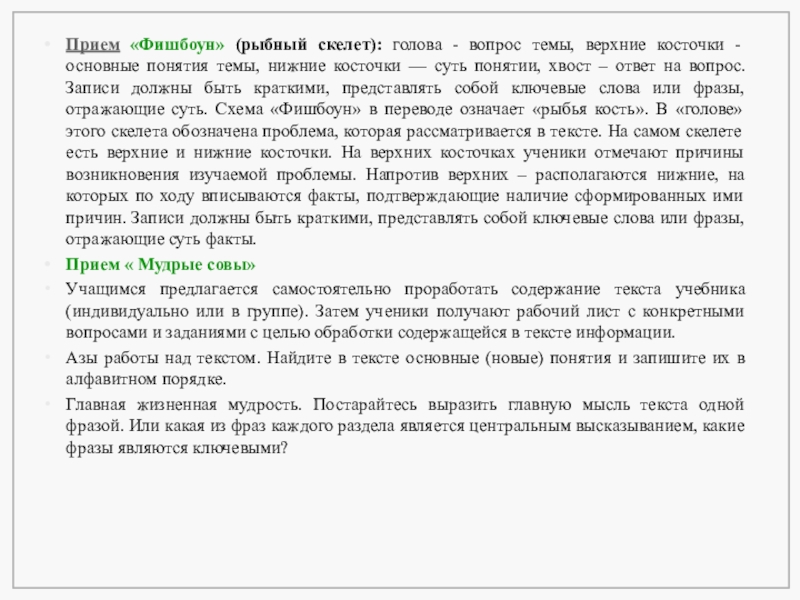 Слайд 12Прием «Фишбоун» (рыбный скелет): голова - вопрос темы, верхние косточки -