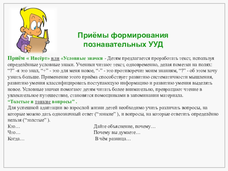 “?” -я это знал, “+” - это для меня новое, “-” - это противоречит моим знаниям, “?” - об этом хочу узнать больше. Применение этого приёма способствует развитию систематичности мышления, развитию умения классифицировать поступающую информацию и развитию умения выделять новое. Условные значки помогают детям читать более внимательно, превращают чтение в увлекательное путешествие, становятся помощниками в запоминании материала.