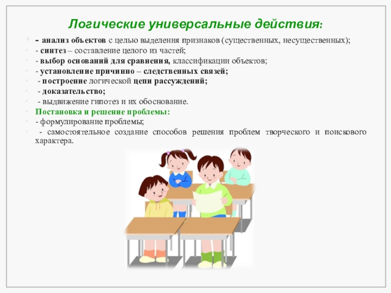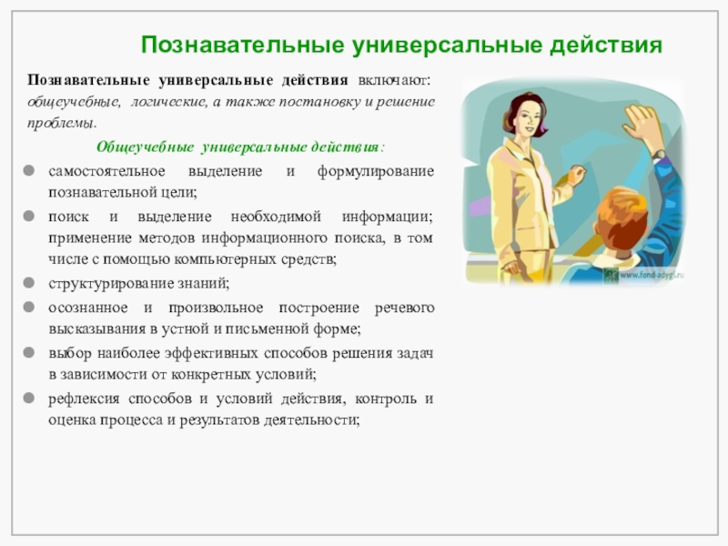 Познавательные универсальные действия включают: общеучебные, логические, а также постановку