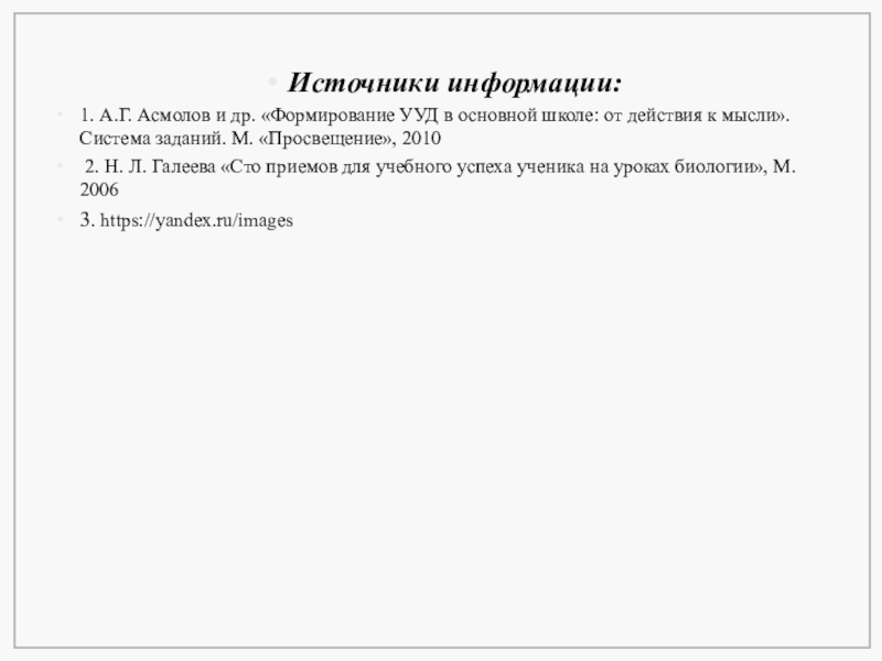 2. Н. Л. Галеева «Сто приемов для учебного успеха ученика на уроках биологии», М. 2006