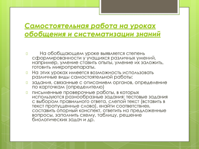 Слайд 11Самостоятельная работа на уроках обобщения и систематизации знаний