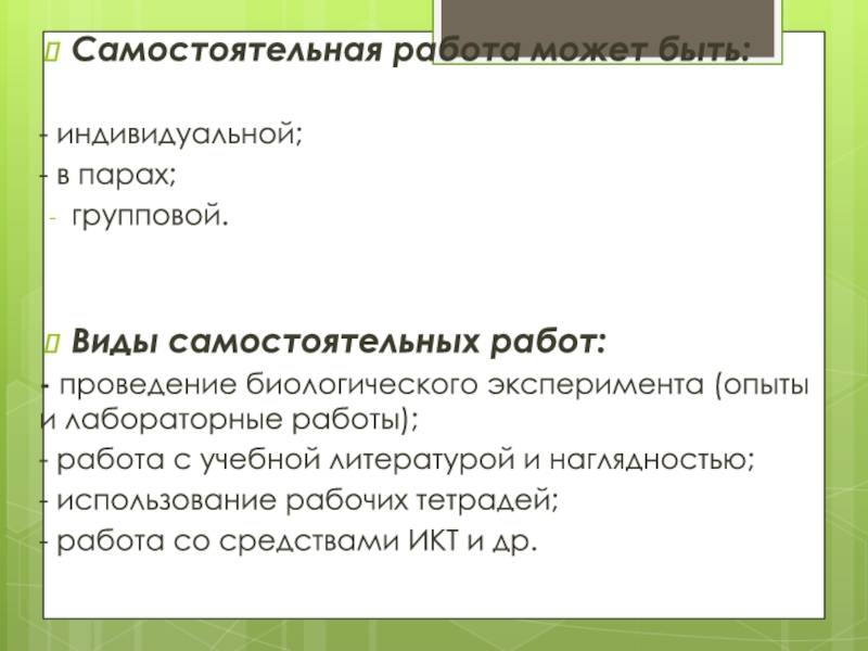 На этих уроках имеется возможность использовать различные виды самостоятельной работы: