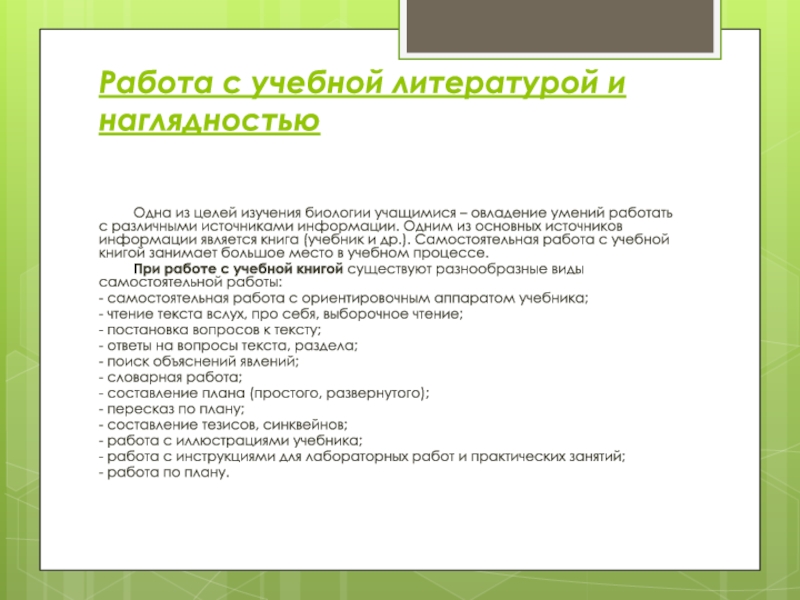 из целей изучения биологии учащимися – овладение умений работать с различными источниками информации. Одним из основных источников информации является книга (учебник и др.). Самостоятельная работа с учебной книгой занимает большое место в учебном процессе.