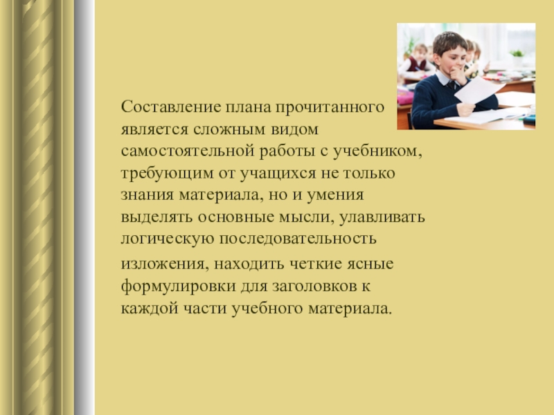 Слайд 3Составление плана прочитанного является сложным видом самостоятельной работы с учебником, требующим