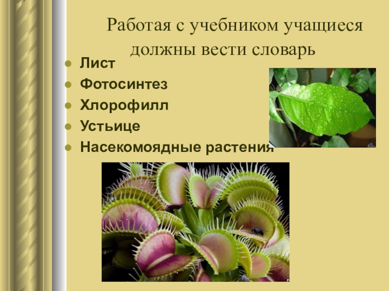 Работая с учебником учащиеся должны вести словарьЛистФотосинтезХлорофиллУстьицеНасекомоядные растения