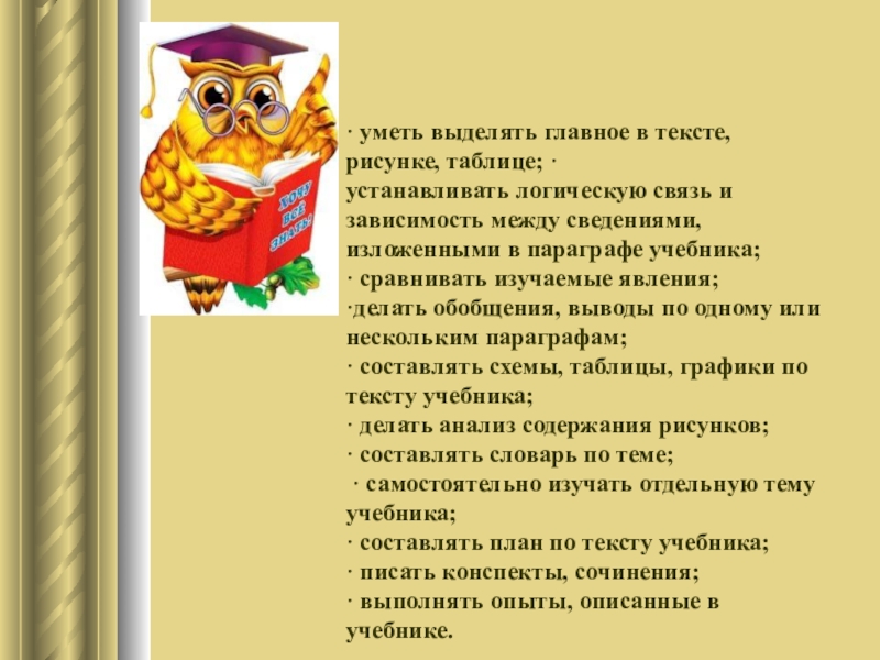 · уметь выделять главное в тексте, рисунке, таблице; ·устанавливать логическую связь и зависимость между сведениями, изложенными в параграфе учебника; · сравнивать изучаемые явления; ·делать обобщения, выводы по одному или нескольким параграфам; · составлять схемы, таблицы, графики