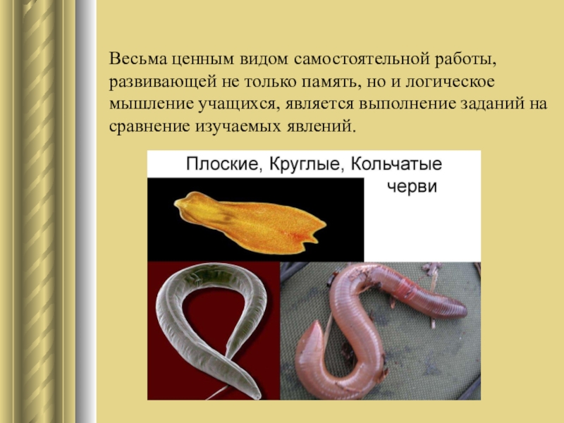 Слайд 4 Весьма ценным видом самостоятельной работы, развивающей не только память, но и