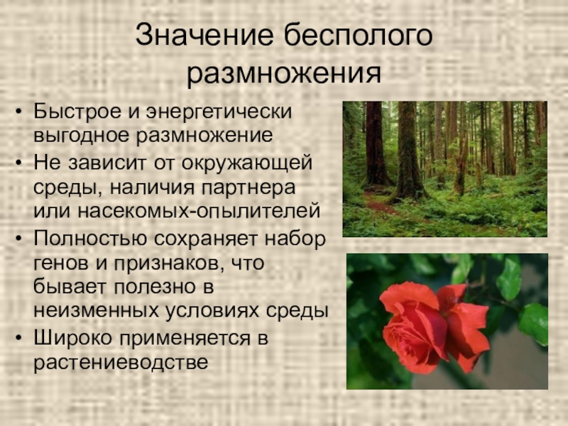 Бесполое размножение активно используют в сельском хозяйстве для размножения растений с набором признаков, полезных для человека. Так, длинными побегами – усами размножают землянику, черенками – плодовые деревья и многие кустарники.