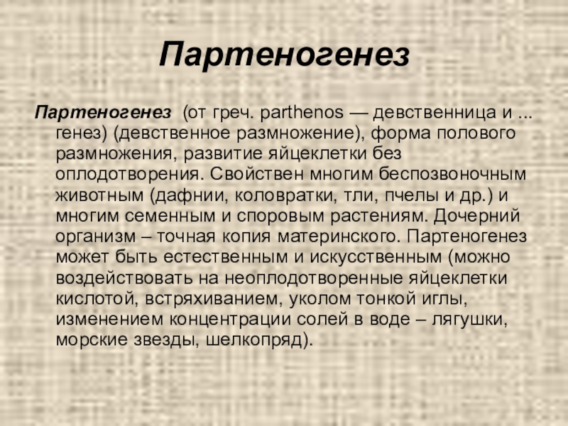 полового размножения, развитие яйцеклетки без оплодотворения. Свойствен многим беспозвоночным животным (дафнии, коловратки, тли, пчелы и др.) и многим семенным и споровым растениям. Дочерний организм – точная копия материнского. Партеногенез может быть естественным и искусственным (можно воздействовать на неоплодотворенные яйцеклетки кислотой, встряхиванием, уколом тонкой иглы, изменением концентрации солей в воде – лягушки, морские звезды, шелкопряд).