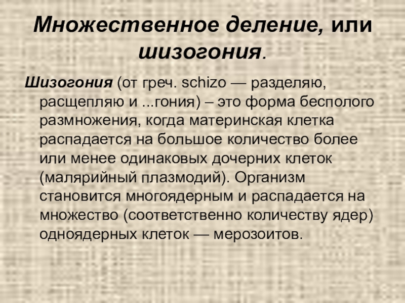 ...гония) – это форма бесполого размножения, когда материнская клетка распадается на большое количество более или менее одинаковых дочерних клеток (малярийный плазмодий). Организм становится многоядерным и распадается на множество (соответственно количеству ядер) одноядерных клеток — мерозоитов.